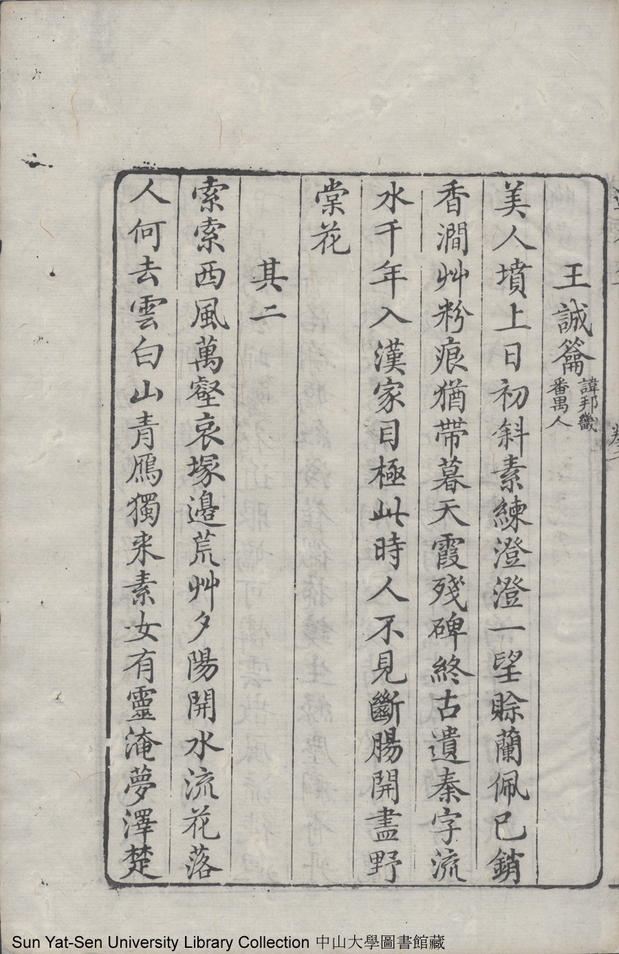 | (PRINT FRIENDLY VERSION) 蓮香集:五卷(明張喬撰)。清乾隆三十年(1765)順德梁釪重刻本 ![]() 頁碼 : 卷二13b | 点 击 放 大 | 返回 |