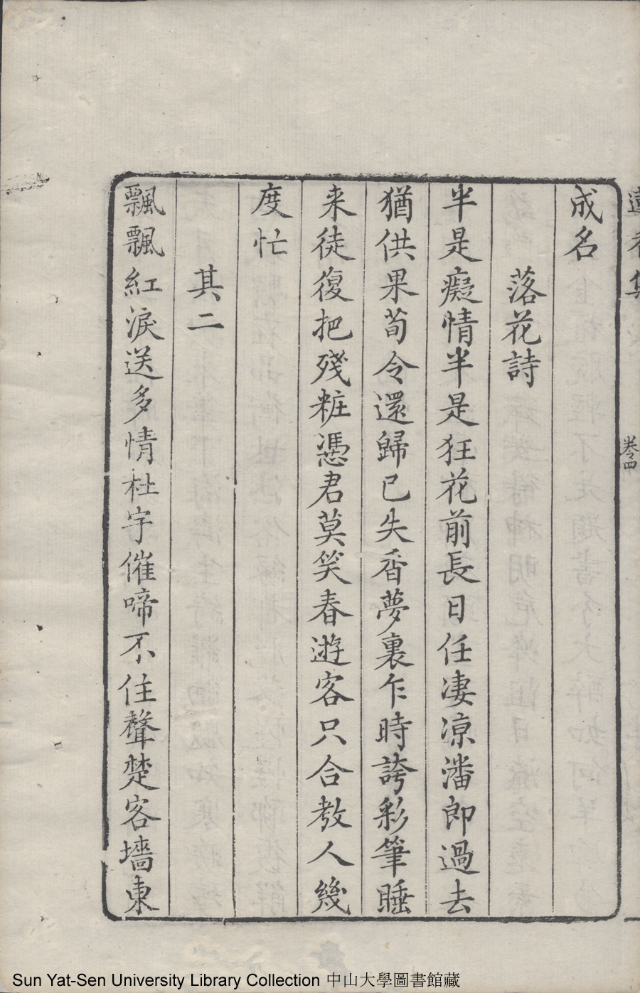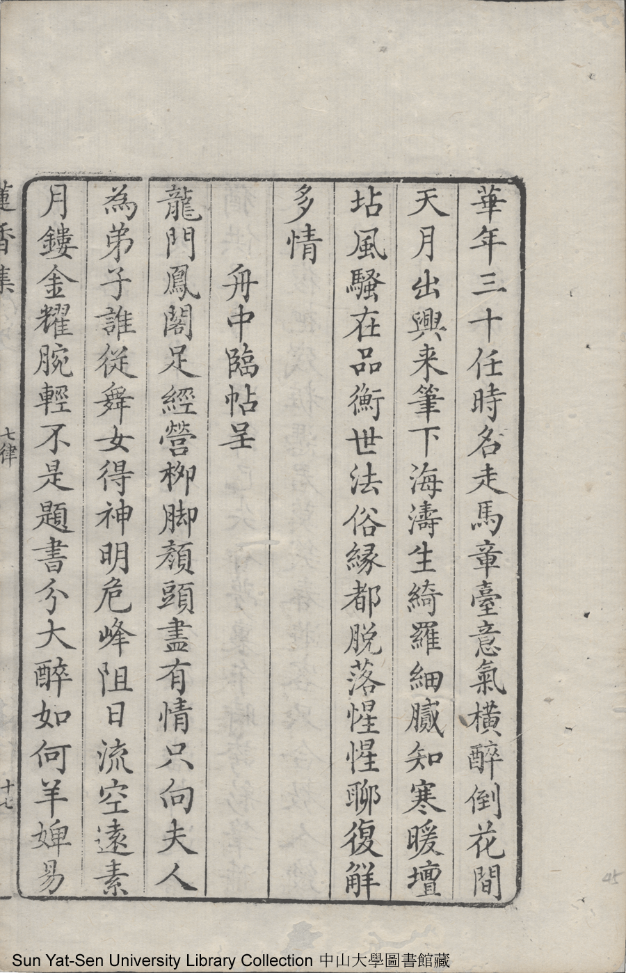 | (PRINT FRIENDLY VERSION) 蓮香集:五卷(明張喬撰)。清乾隆三十年(1765)順德梁釪重刻本 ![]() 頁碼 : 卷四17b | 点 击 放 大 | 蓮香集:五卷(明張喬撰)。清乾隆三十年(1765)順德梁釪重刻本![]() 頁碼 : 卷四17a | 点 击 放 大 | 返回 |