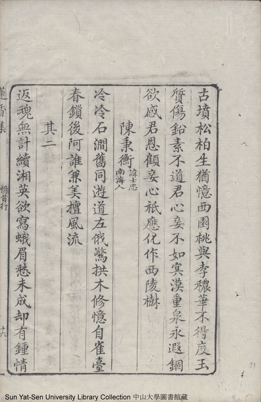 | (PRINT FRIENDLY VERSION) 蓮香集:五卷(明張喬撰)。清乾隆三十年(1765)順德梁釪重刻本 ![]() 頁碼 : 卷二16b | 点 击 放 大 | 蓮香集:五卷(明張喬撰)。清乾隆三十年(1765)順德梁釪重刻本![]() 頁碼 : 卷二16a | 点 击 放 大 | 返回 |