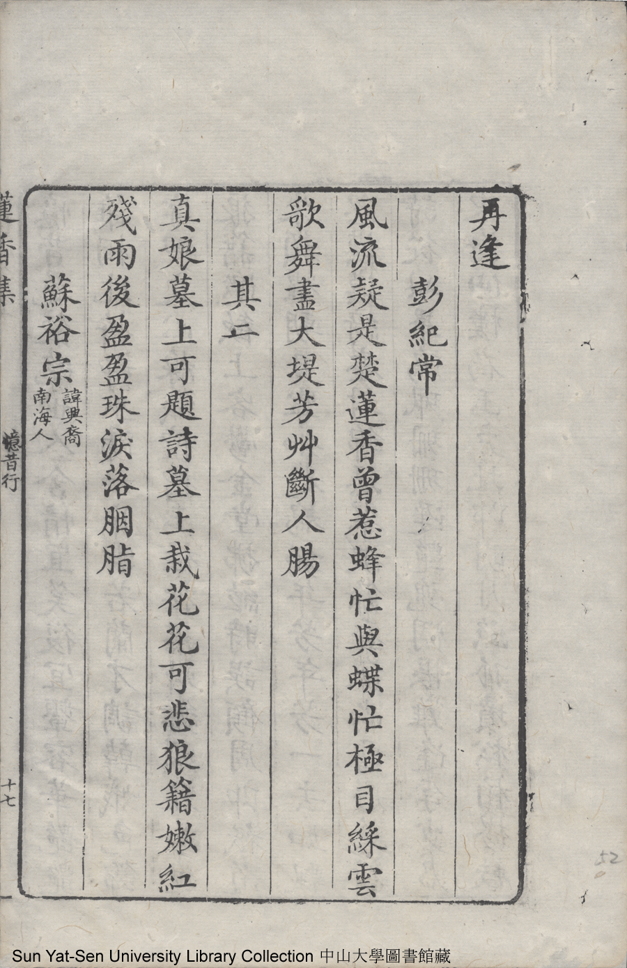 | (PRINT FRIENDLY VERSION) 蓮香集:五卷(明張喬撰)。清乾隆三十年(1765)順德梁釪重刻本 ![]() 頁碼 : 卷二17a | 点 击 放 大 | 蓮香集:五卷(明張喬撰)。清乾隆三十年(1765)順德梁釪重刻本![]() 頁碼 : 卷二16b | 点 击 放 大 | 返回 |