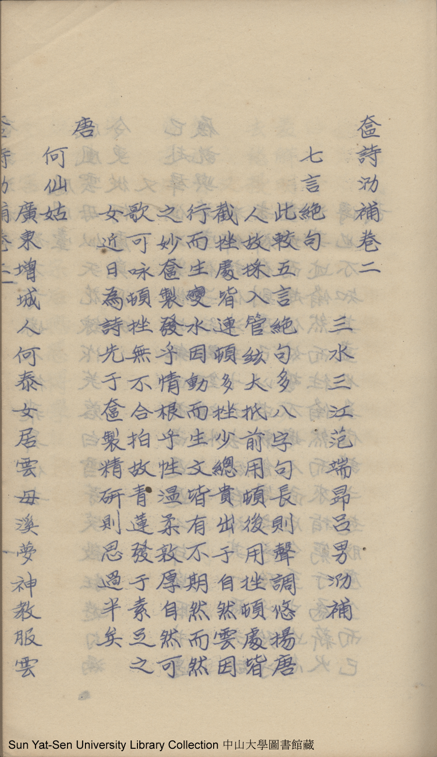 | (PRINT FRIENDLY VERSION) 奩詩泐補:二卷,奩泐續補:三卷(清范端昂輯)。1955年胡氏復寫本 ![]() 頁碼 : 奩詩泐補卷二1a | 点 击 放 大 | 返回 |