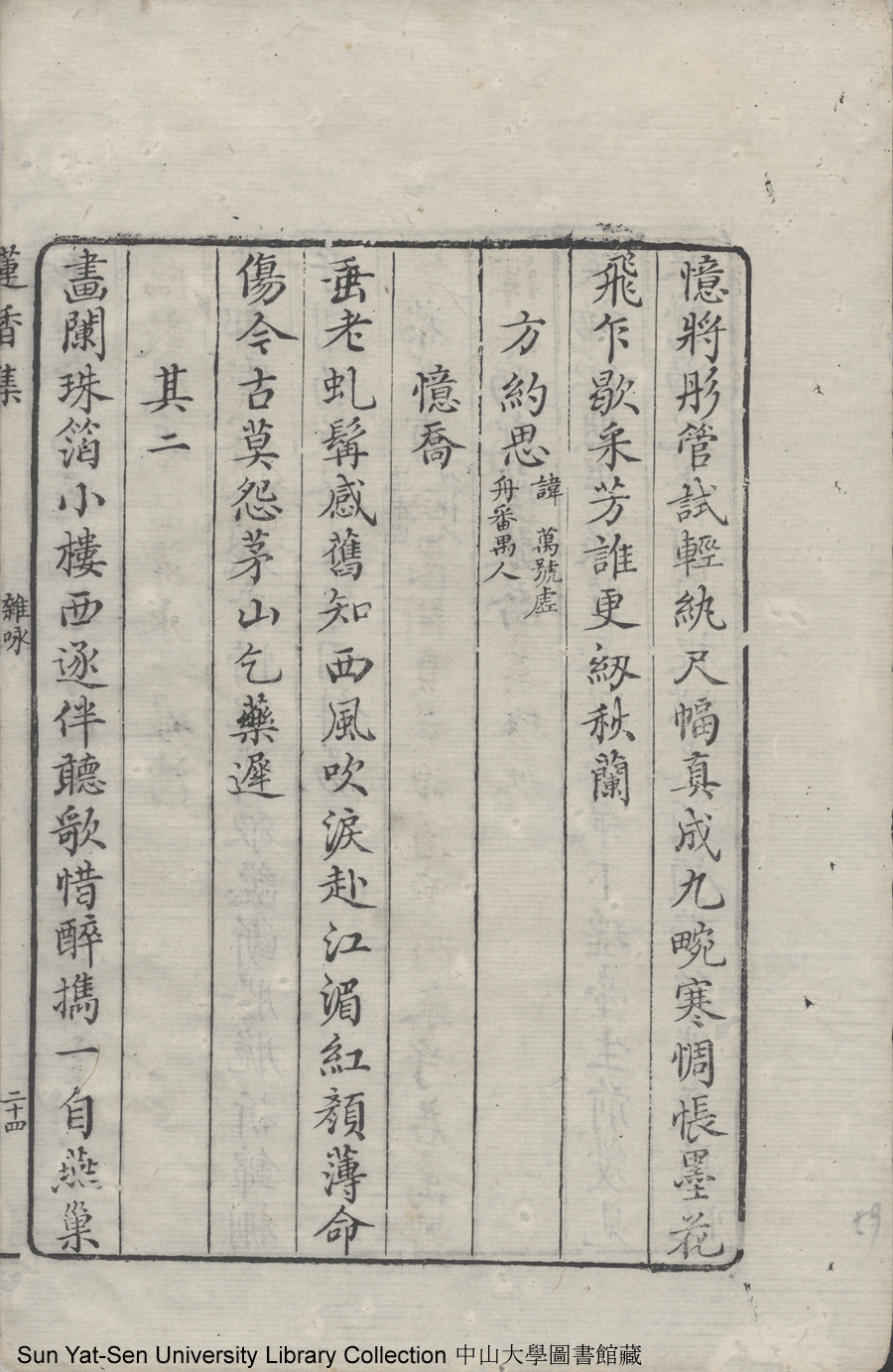 | (PRINT FRIENDLY VERSION) 蓮香集:五卷(明張喬撰)。清乾隆三十年(1765)順德梁釪重刻本 ![]() 頁碼 : 卷二24b | 点 击 放 大 | 蓮香集:五卷(明張喬撰)。清乾隆三十年(1765)順德梁釪重刻本![]() 頁碼 : 卷二24a | 点 击 放 大 | 返回 |