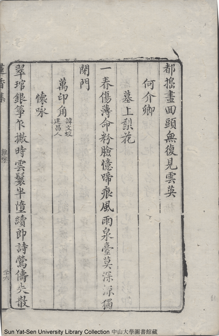 | (PRINT FRIENDLY VERSION) 蓮香集:五卷(明張喬撰)。清乾隆三十年(1765)順德梁釪重刻本 ![]() 頁碼 : 卷二26a | 点 击 放 大 | 返回 |
