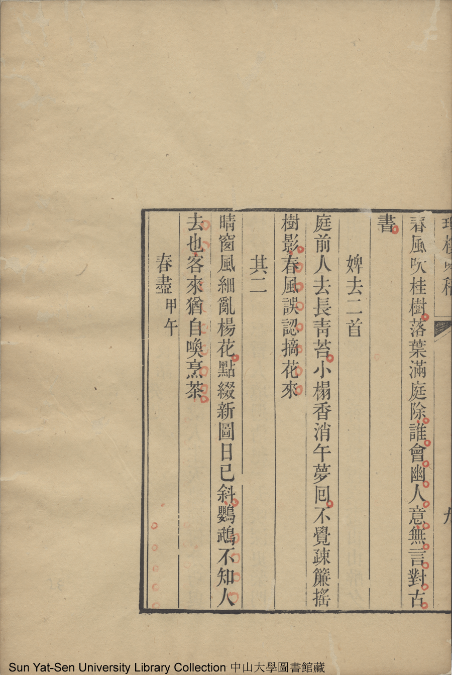 | (PRINT FRIENDLY VERSION) 瓊樓吟稿:一卷(清陶善撰)。清光緒九年(1883)刻本 ![]() 頁碼 : 吟稿9b | 点 击 放 大 | 返回 |