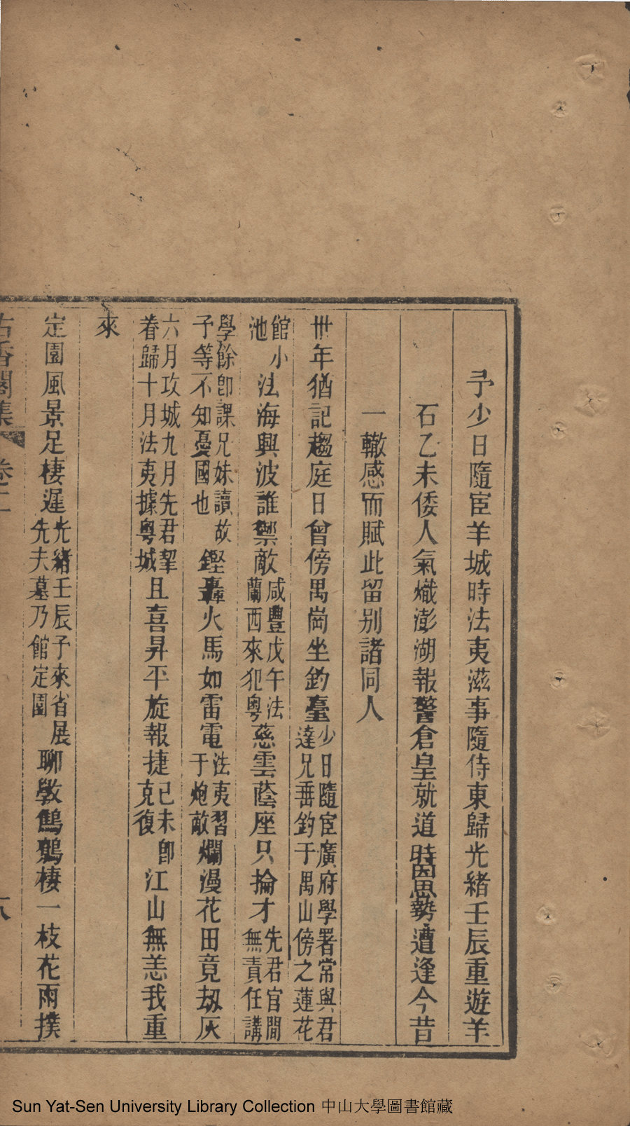 詩詞 [予少日隨宦羊城時法夷滋事隨侍東歸光緒壬辰重遊羊石乙未倭人氣熾澎湖報警倉皇就道時因思勢遭逢今昔一轍感而賦此留別諸同人(五首)]