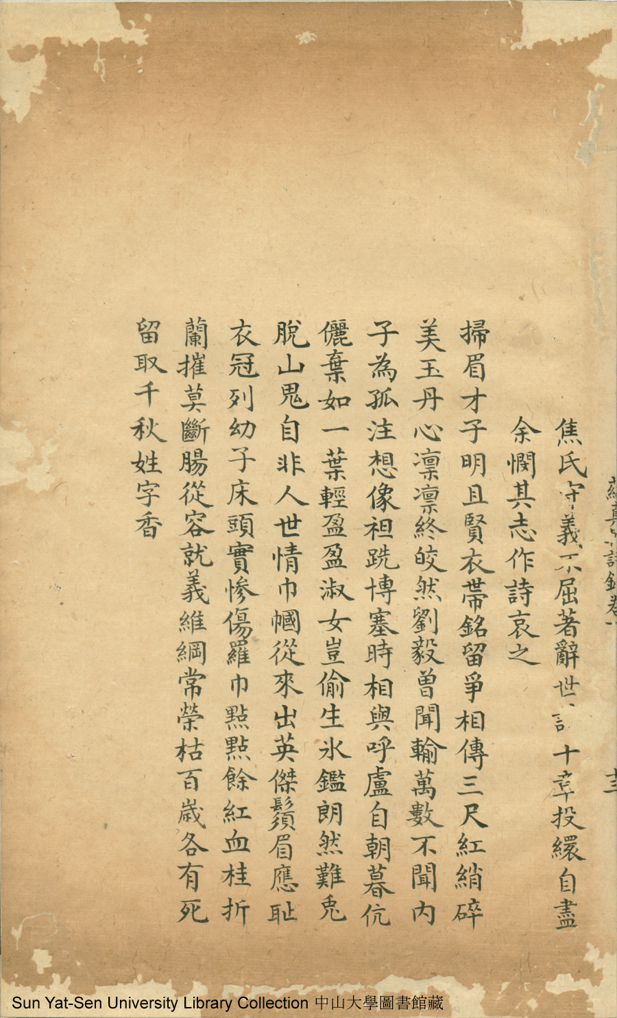 詩詞 [時聞江南有人無行躭博口而輸其妻者妻焦氏守義不屈著辭世[詩]十章投繯自盡余憫其志作詩哀之]