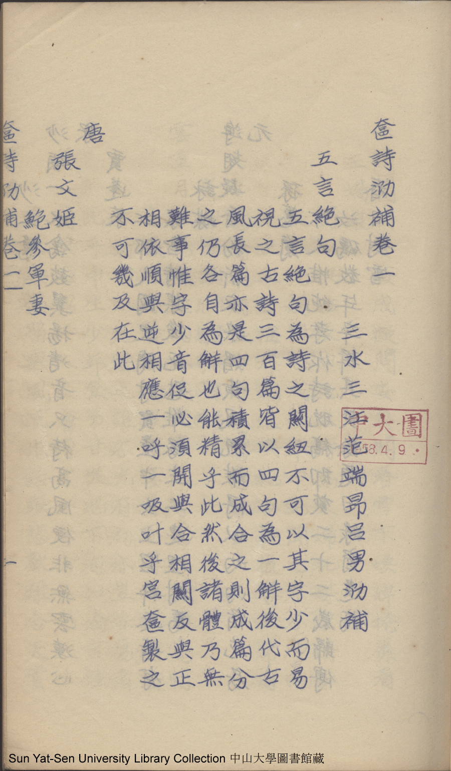 | (PRINT FRIENDLY VERSION) 奩詩泐補:二卷,奩泐續補:三卷(清范端昂輯)。1955年胡氏復寫本 ![]() 頁碼 : 奩詩泐補卷一1a | 点 击 放 大 | 返回 |