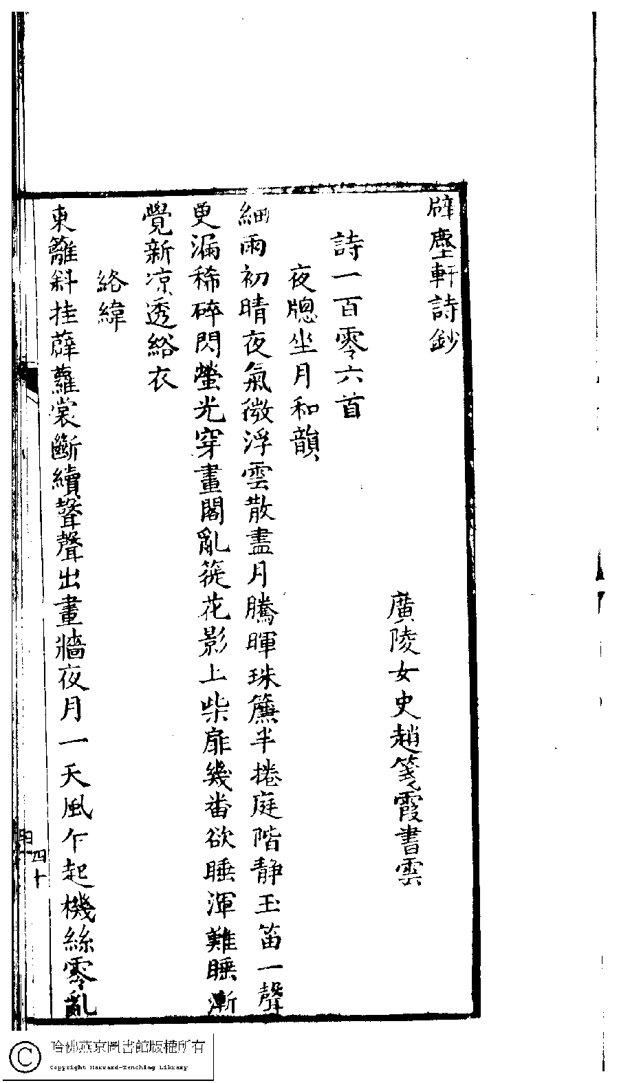 | 原書: 泰州仲氏閨秀集合刻﹕七種(清仲蓮慶等撰): 辟塵軒詩鈔﹕一卷 |
