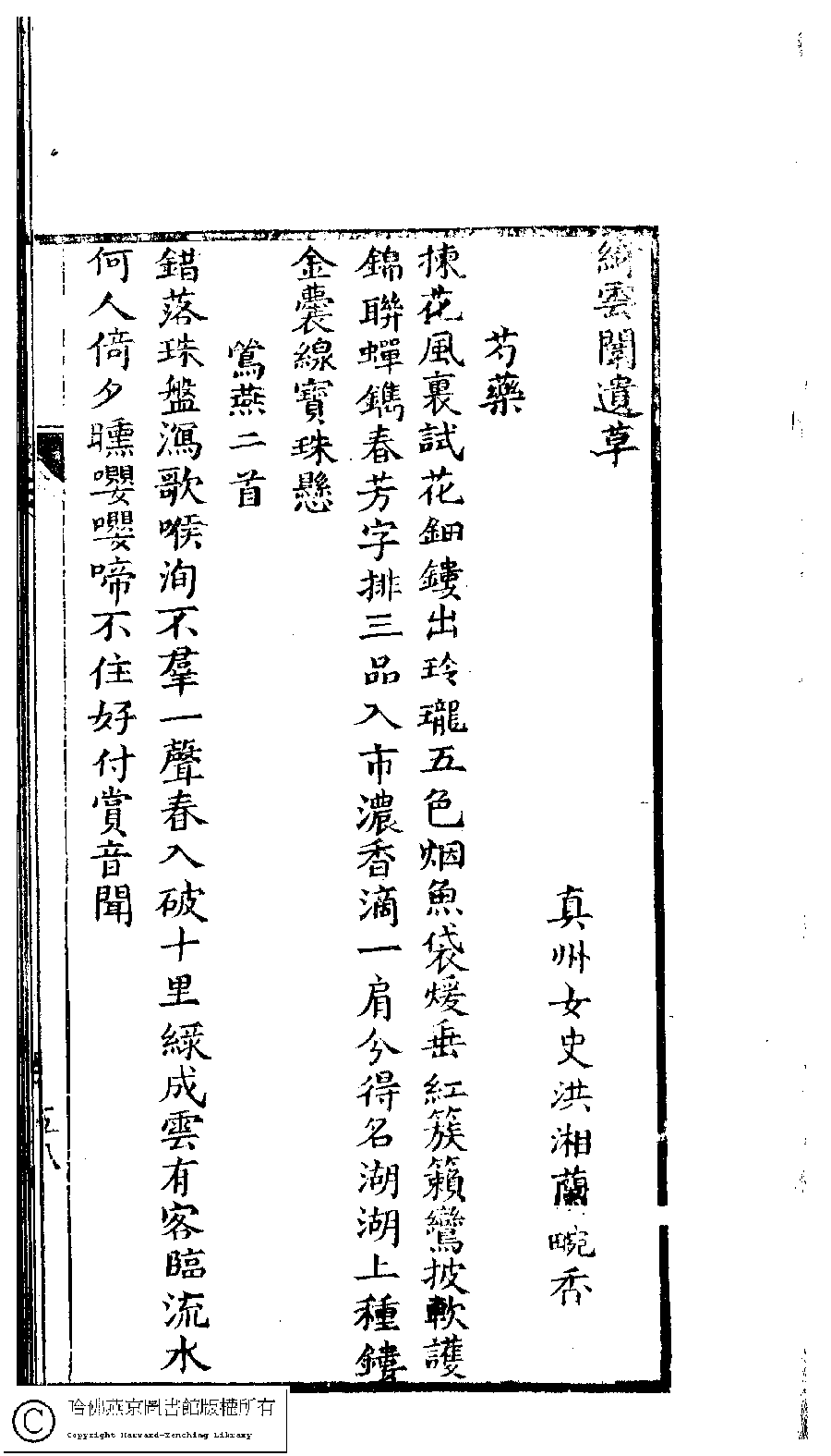 | (PRINT FRIENDLY VERSION) 泰州仲氏閨秀集合刻﹕七種(清仲蓮慶等撰) : 綺雲闈遺草﹕一卷。清嘉慶十二年(1807)刻本。 ![]() 頁碼 : 58b | 点 击 放 大 | 泰州仲氏閨秀集合刻﹕七種(清仲蓮慶等撰) : 綺雲闈遺草﹕一卷。清嘉慶十二年(1807)刻本。![]() 頁碼 : 58a | 点 击 放 大 | 返回 |