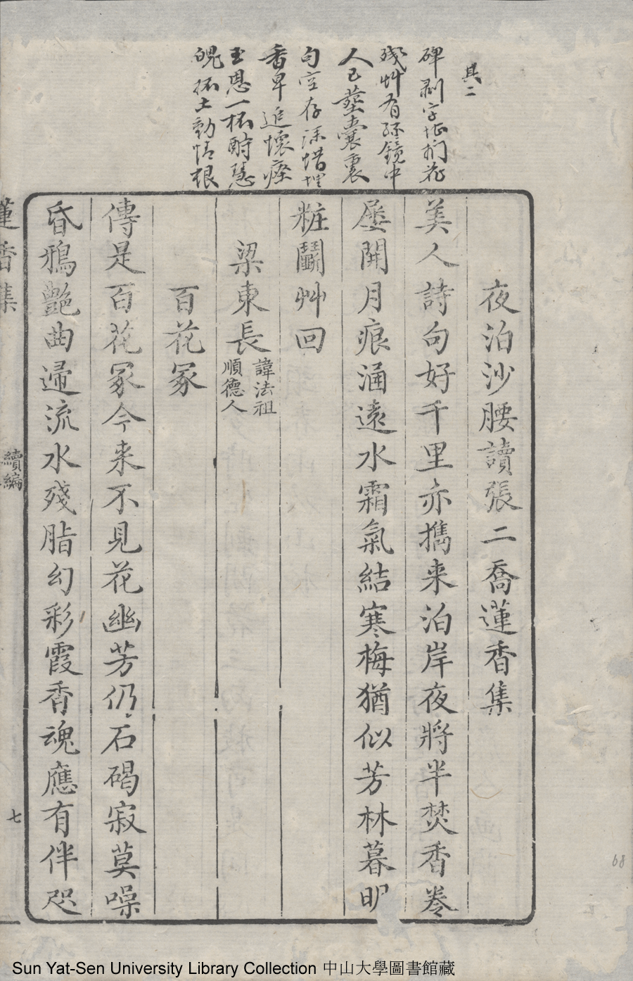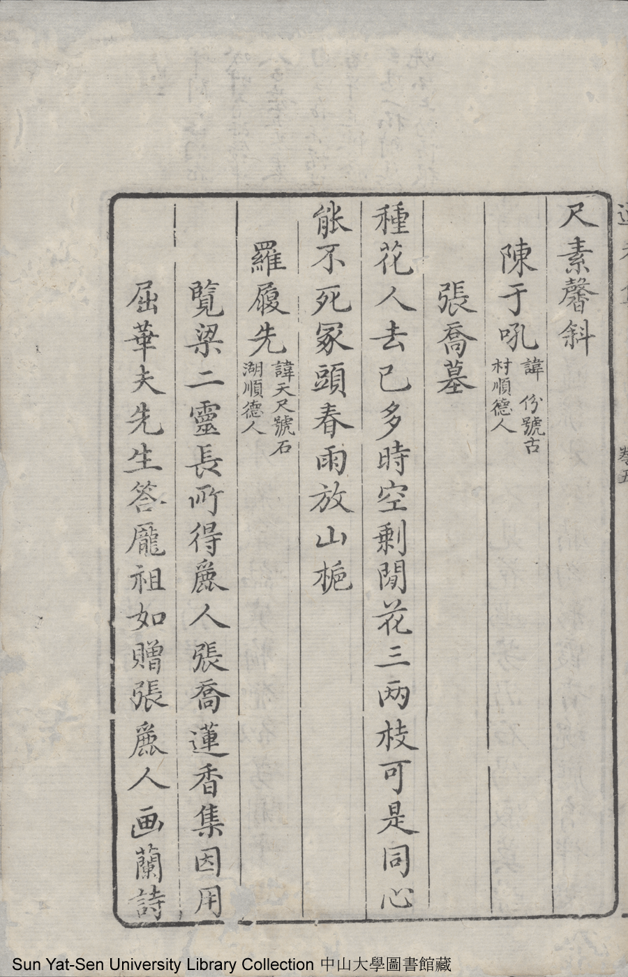 | (PRINT FRIENDLY VERSION) 蓮香集:五卷(明張喬撰)。清乾隆三十年(1765)順德梁釪重刻本 ![]() 頁碼 : 卷五7b | 点 击 放 大 | 蓮香集:五卷(明張喬撰)。清乾隆三十年(1765)順德梁釪重刻本![]() 頁碼 : 卷五7a | 点 击 放 大 | 返回 |