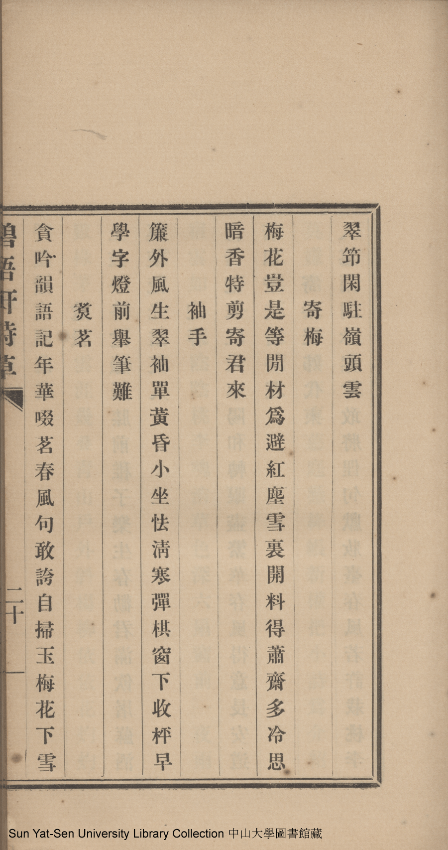 | (PRINT FRIENDLY VERSION) 碧梧軒詩草:一卷(清許桐撰)。民國二十六年(1927)鉛印本 ![]() 頁碼 : 詩草20a | 点 击 放 大 | 碧梧軒詩草:一卷(清許桐撰)。民國二十六年(1927)鉛印本![]() 頁碼 : 詩草19b | 点 击 放 大 | 返回 |