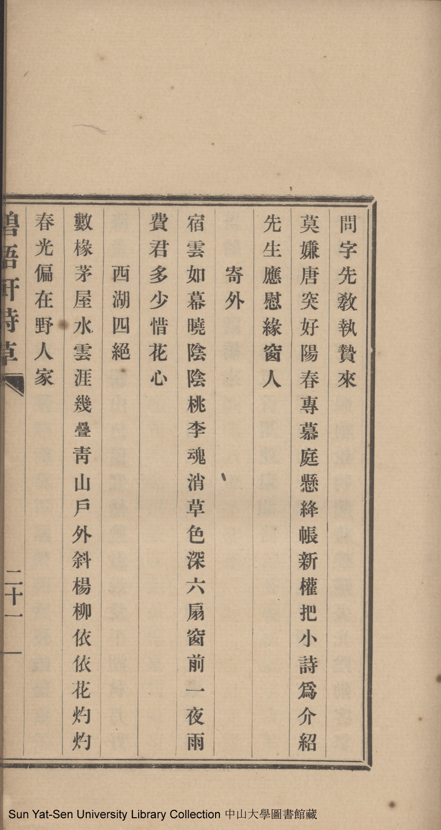 | (PRINT FRIENDLY VERSION) 碧梧軒詩草:一卷(清許桐撰)。民國二十六年(1927)鉛印本 ![]() 頁碼 : 詩草21a | 点 击 放 大 | 碧梧軒詩草:一卷(清許桐撰)。民國二十六年(1927)鉛印本![]() 頁碼 : 詩草20b | 点 击 放 大 | 返回 |
