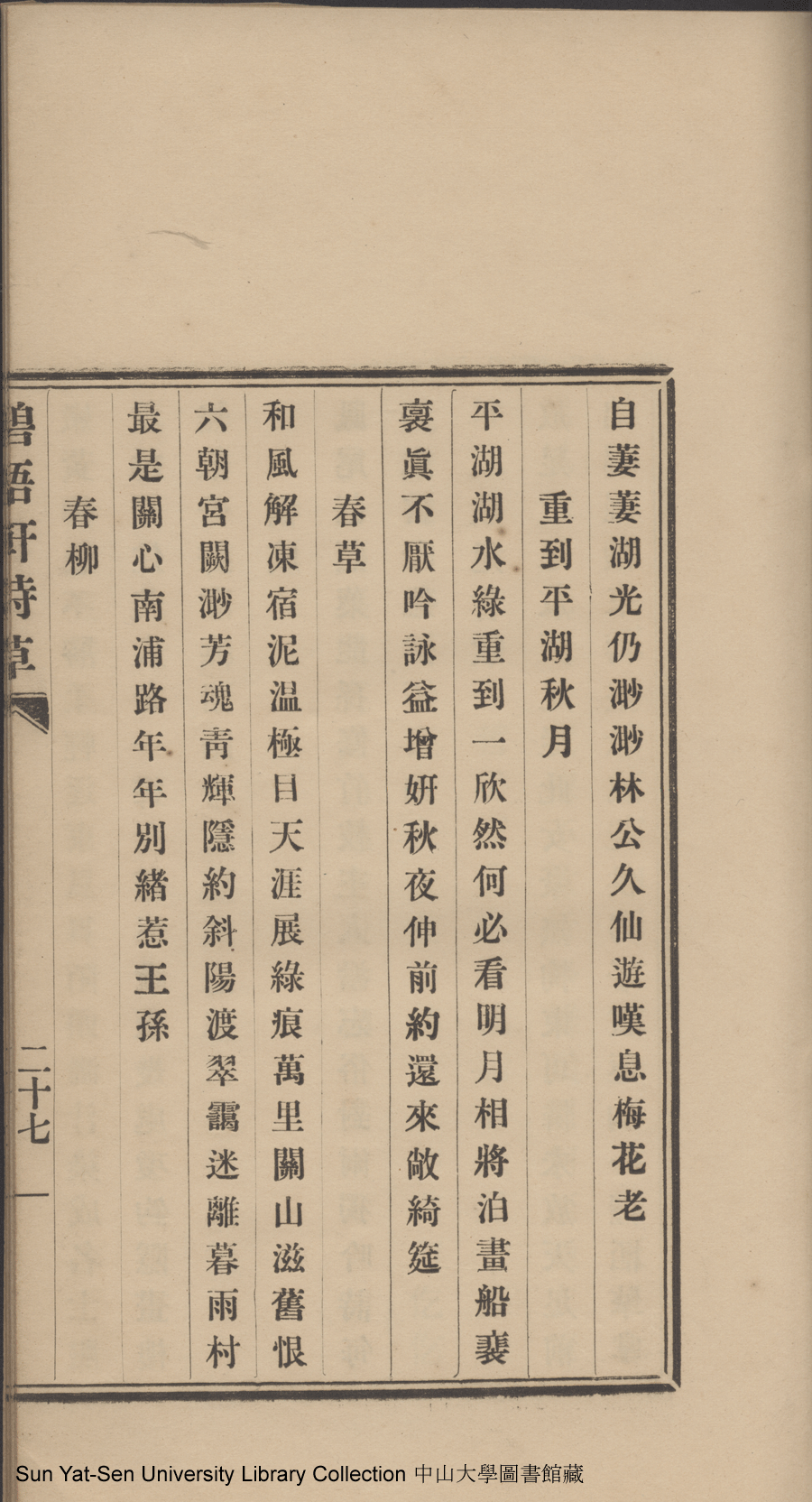 | (PRINT FRIENDLY VERSION) 碧梧軒詩草:一卷(清許桐撰)。民國二十六年(1927)鉛印本 ![]() 頁碼 : 詩草27a | 点 击 放 大 | 返回 |