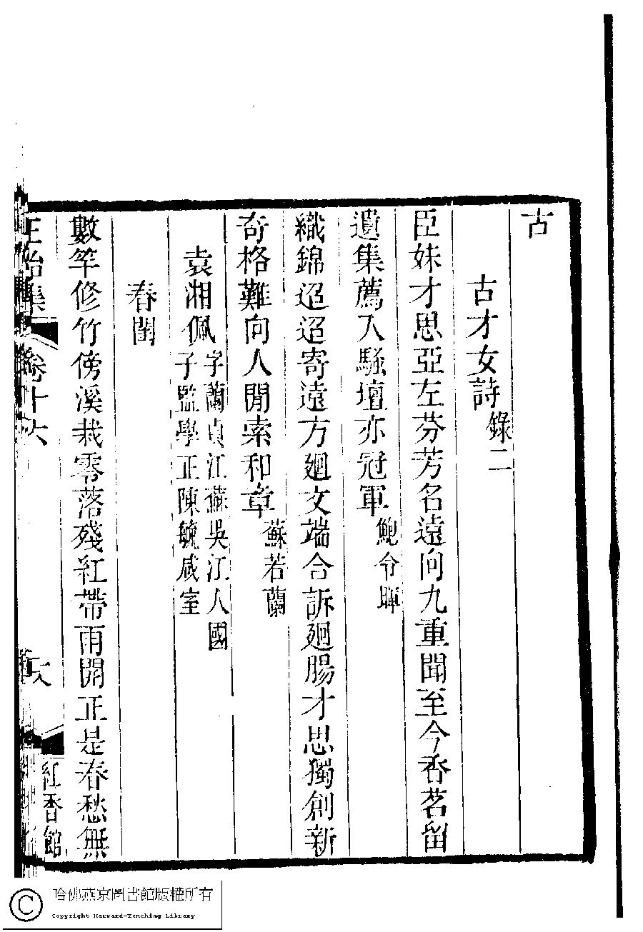 | 原書: 國朝閨秀正始集﹕二十卷﹐附錄﹕一卷﹐補遺﹕一卷﹐又附題詞﹕一卷(清惲珠輯) |