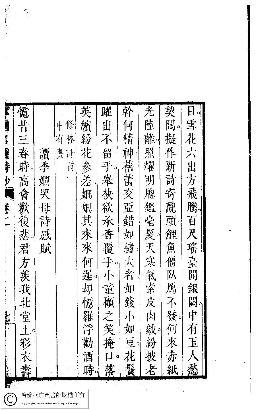 | (PRINT FRIENDLY VERSION) 本朝名媛詩鈔﹕六卷(清胡孝思輯)。清康熙五十五年(1716)凌雲閣刻本 ![]() 頁碼 : 2.7a | 点 击 放 大 | 本朝名媛詩鈔﹕六卷(清胡孝思輯)。清康熙五十五年(1716)凌雲閣刻本![]() 頁碼 : 2.6b | 点 击 放 大 | 返回 |