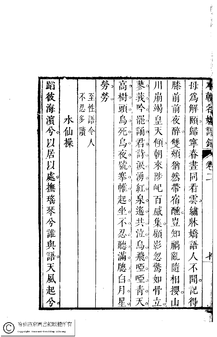 | (PRINT FRIENDLY VERSION) 本朝名媛詩鈔﹕六卷(清胡孝思輯)。清康熙五十五年(1716)凌雲閣刻本 ![]() 頁碼 : 2.8a | 点 击 放 大 | 本朝名媛詩鈔﹕六卷(清胡孝思輯)。清康熙五十五年(1716)凌雲閣刻本![]() 頁碼 : 2.7b | 点 击 放 大 | 返回 |