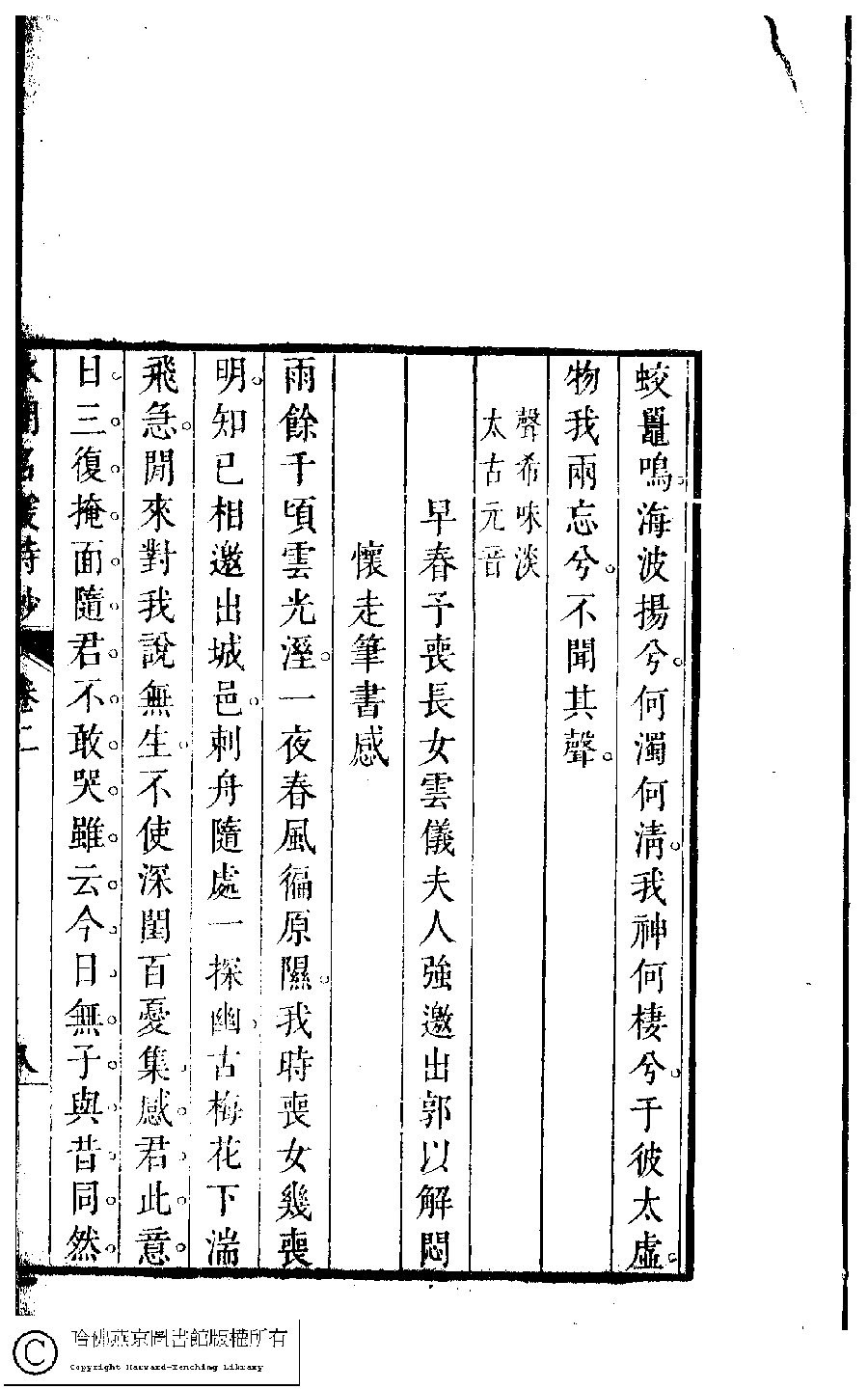 | (PRINT FRIENDLY VERSION) 本朝名媛詩鈔﹕六卷(清胡孝思輯)。清康熙五十五年(1716)凌雲閣刻本 ![]() 頁碼 : 2.8b | 点 击 放 大 | 本朝名媛詩鈔﹕六卷(清胡孝思輯)。清康熙五十五年(1716)凌雲閣刻本![]() 頁碼 : 2.8a | 点 击 放 大 | 返回 |