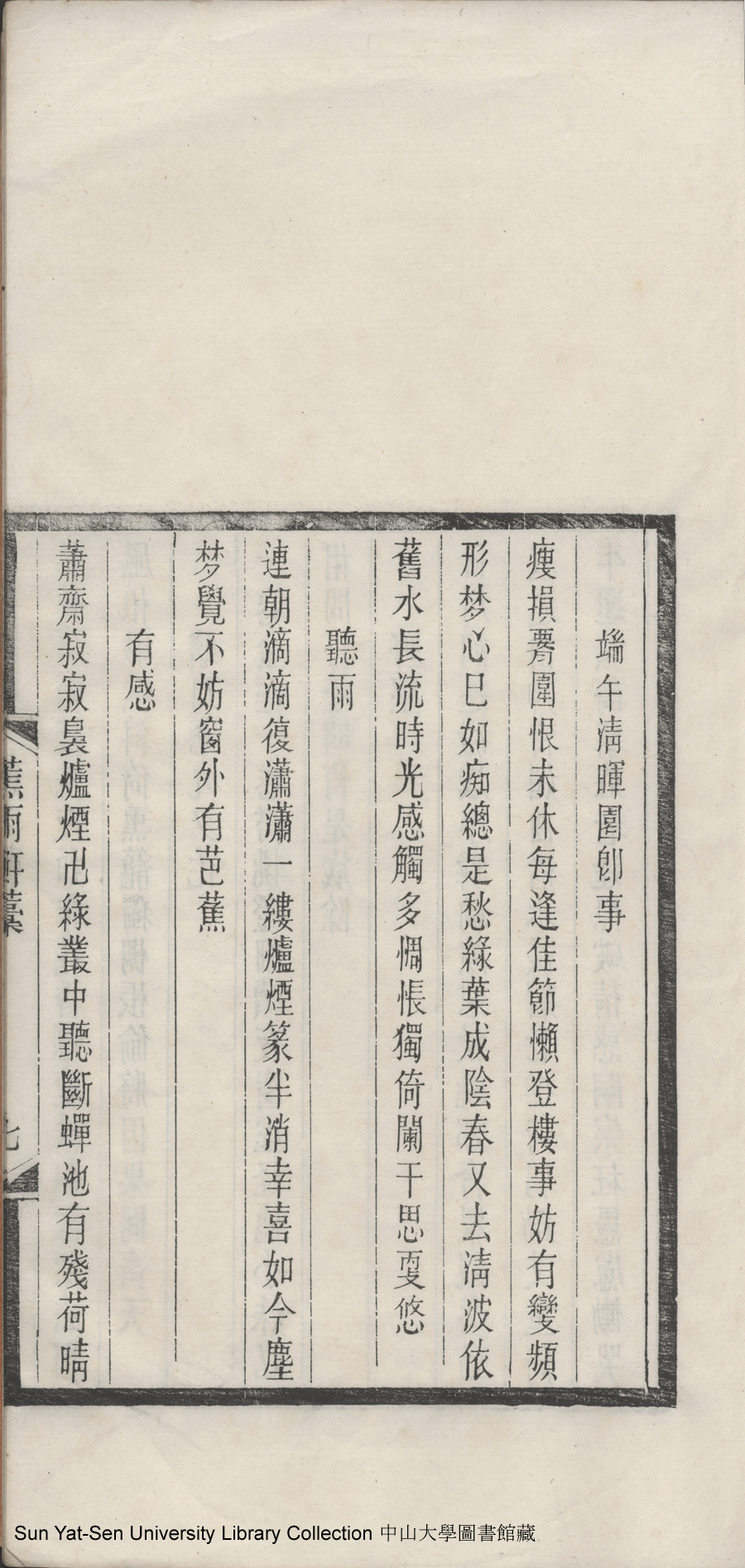 | (PRINT FRIENDLY VERSION) 蕉雨軒稿:一卷(清龍唫薌撰)。清光緒三十四年(1908)刻本 ![]() 頁碼 : 稿7a | 点 击 放 大 | 返回 |