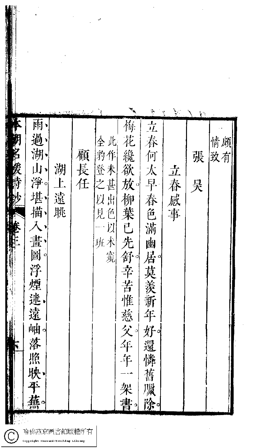 | (PRINT FRIENDLY VERSION) 本朝名媛詩鈔﹕六卷(清胡孝思輯)。清康熙五十五年(1716)凌雲閣刻本 ![]() 頁碼 : 4.6a | 点 击 放 大 | 本朝名媛詩鈔﹕六卷(清胡孝思輯)。清康熙五十五年(1716)凌雲閣刻本![]() 頁碼 : 3.5b | 点 击 放 大 | 返回 |
