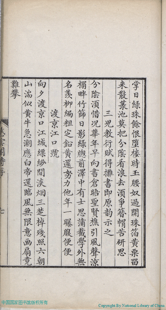 | (PRINT FRIENDLY VERSION) 慈雲閣詩存:一卷(清朱逵撰)。清乾隆三十年(1765)刻本 ![]() 頁碼 : 詩存.7a | 点 击 放 大 | 慈雲閣詩存:一卷(清朱逵撰)。清乾隆三十年(1765)刻本![]() 頁碼 : 詩存.6b | 点 击 放 大 | 返回 |