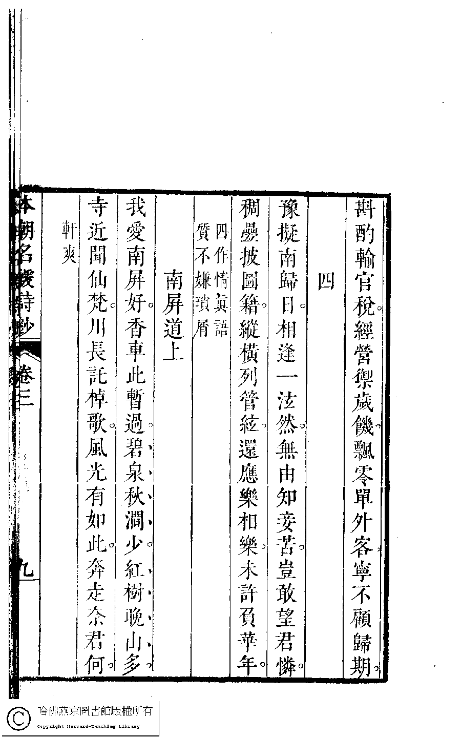 | (PRINT FRIENDLY VERSION) 本朝名媛詩鈔﹕六卷(清胡孝思輯)。清康熙五十五年(1716)凌雲閣刻本 ![]() 頁碼 : 3.9a | 点 击 放 大 | 本朝名媛詩鈔﹕六卷(清胡孝思輯)。清康熙五十五年(1716)凌雲閣刻本![]() 頁碼 : 3.8b | 点 击 放 大 | 返回 |