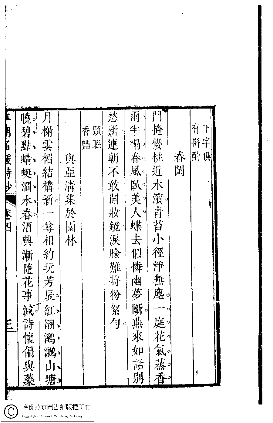 | (PRINT FRIENDLY VERSION) 本朝名媛詩鈔﹕六卷(清胡孝思輯)。清康熙五十五年(1716)凌雲閣刻本 ![]() 頁碼 : 4.3a | 点 击 放 大 | 返回 |