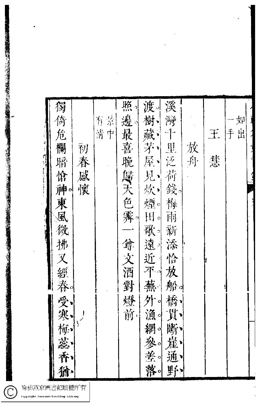 | (PRINT FRIENDLY VERSION) 本朝名媛詩鈔﹕六卷(清胡孝思輯)。清康熙五十五年(1716)凌雲閣刻本 ![]() 頁碼 : 4.4b | 点 击 放 大 | 返回 |