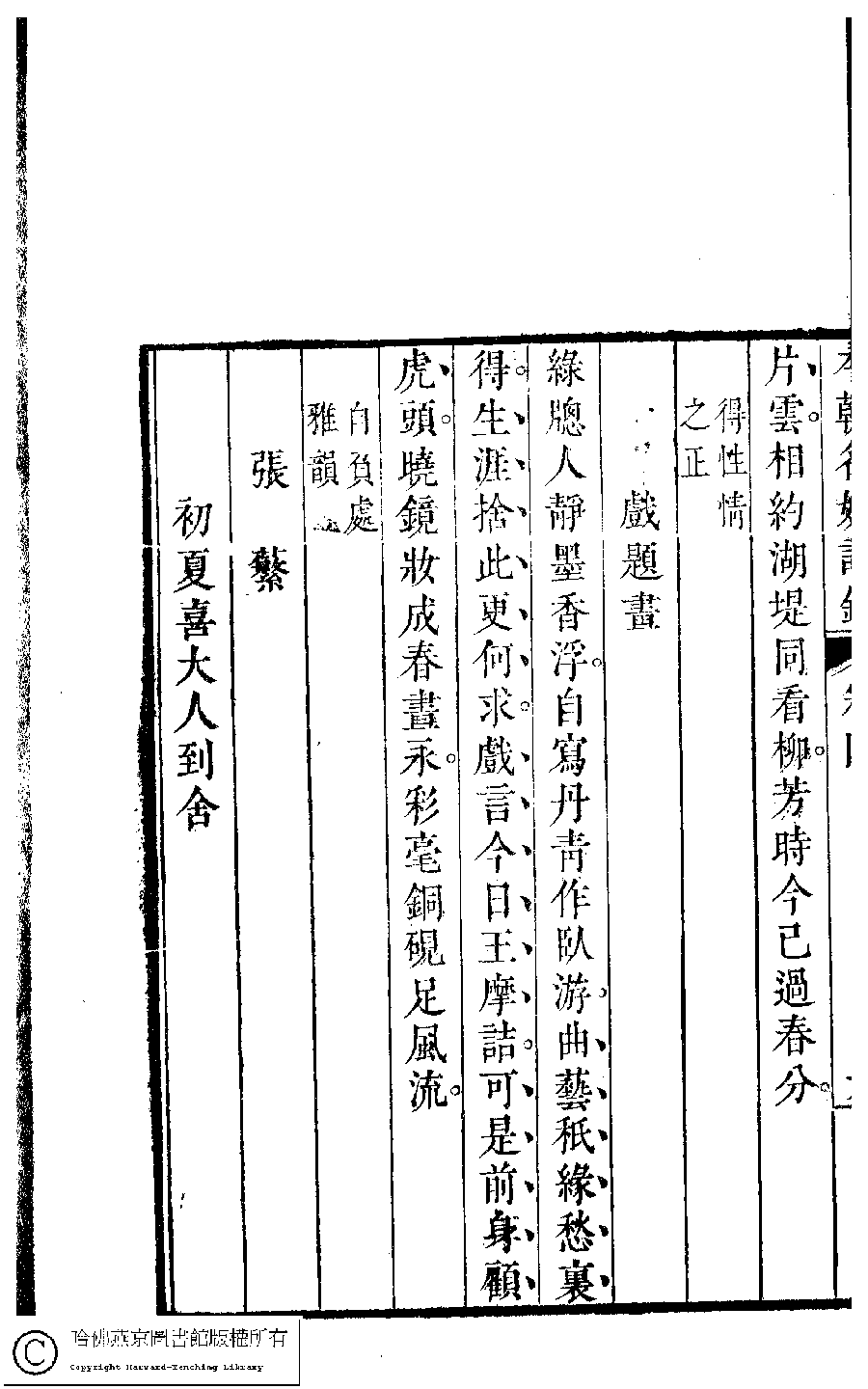 | (PRINT FRIENDLY VERSION) 本朝名媛詩鈔﹕六卷(清胡孝思輯)。清康熙五十五年(1716)凌雲閣刻本 ![]() 頁碼 : 4.6b | 点 击 放 大 | 返回 |