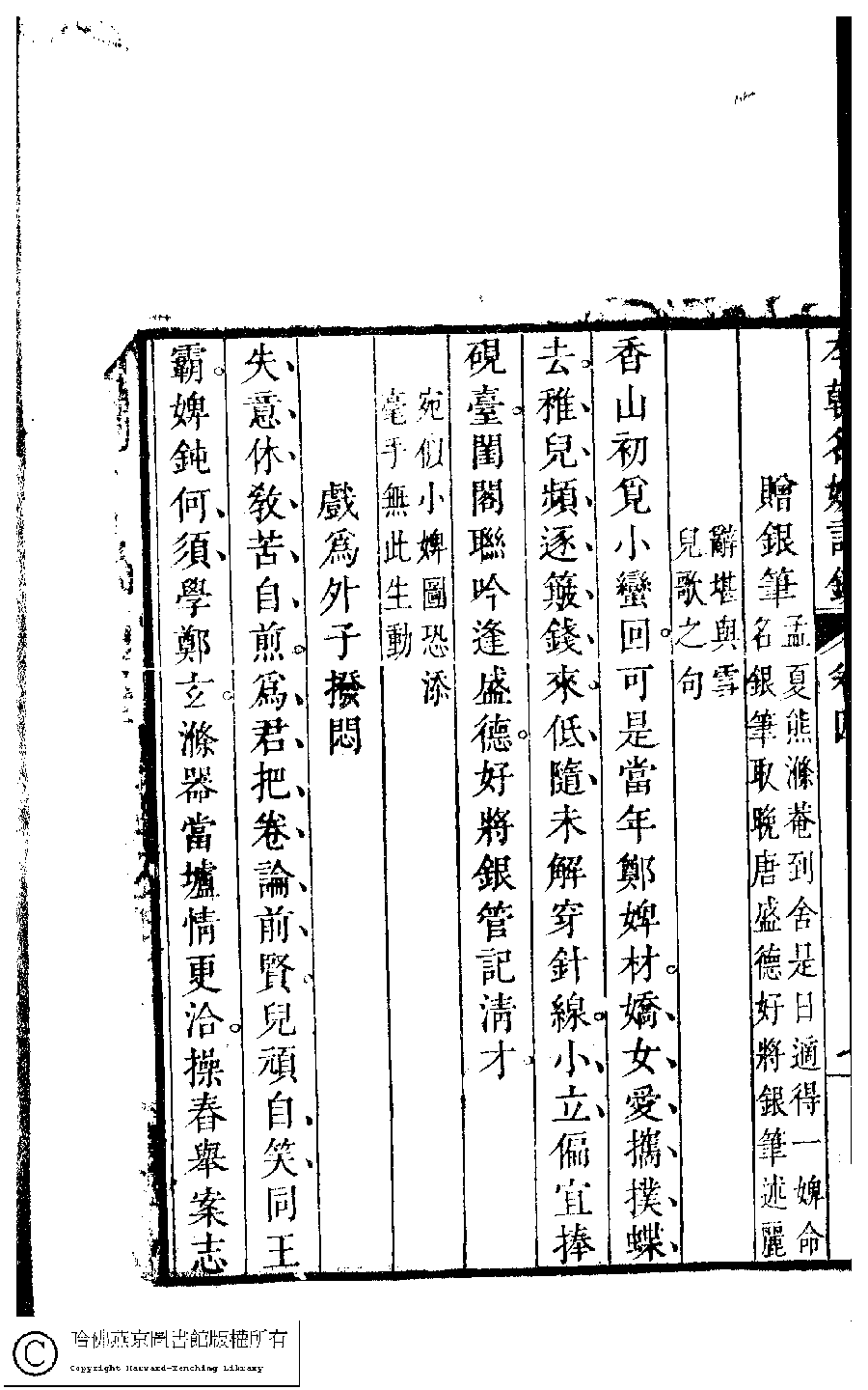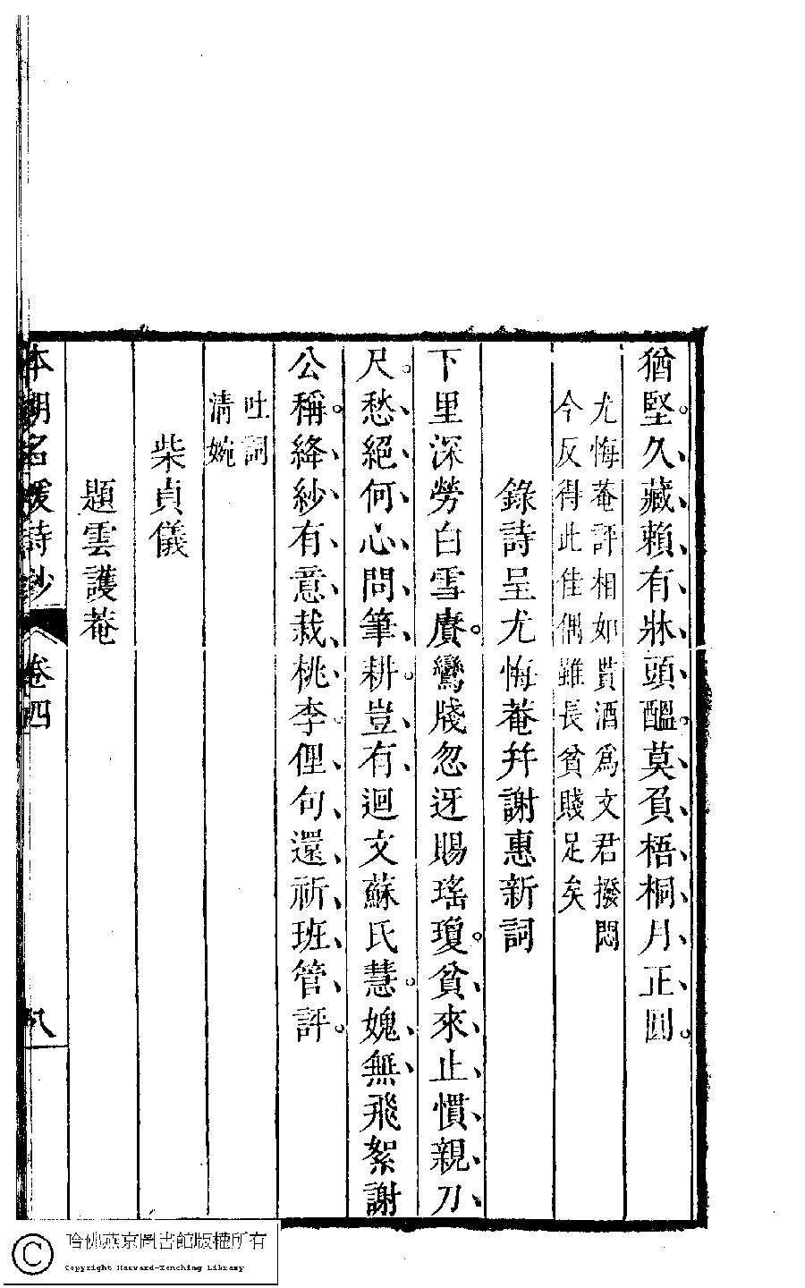 | (PRINT FRIENDLY VERSION) 本朝名媛詩鈔﹕六卷(清胡孝思輯)。清康熙五十五年(1716)凌雲閣刻本 ![]() 頁碼 : 4.8a | 点 击 放 大 | 本朝名媛詩鈔﹕六卷(清胡孝思輯)。清康熙五十五年(1716)凌雲閣刻本![]() 頁碼 : 4.7b | 点 击 放 大 | 返回 |