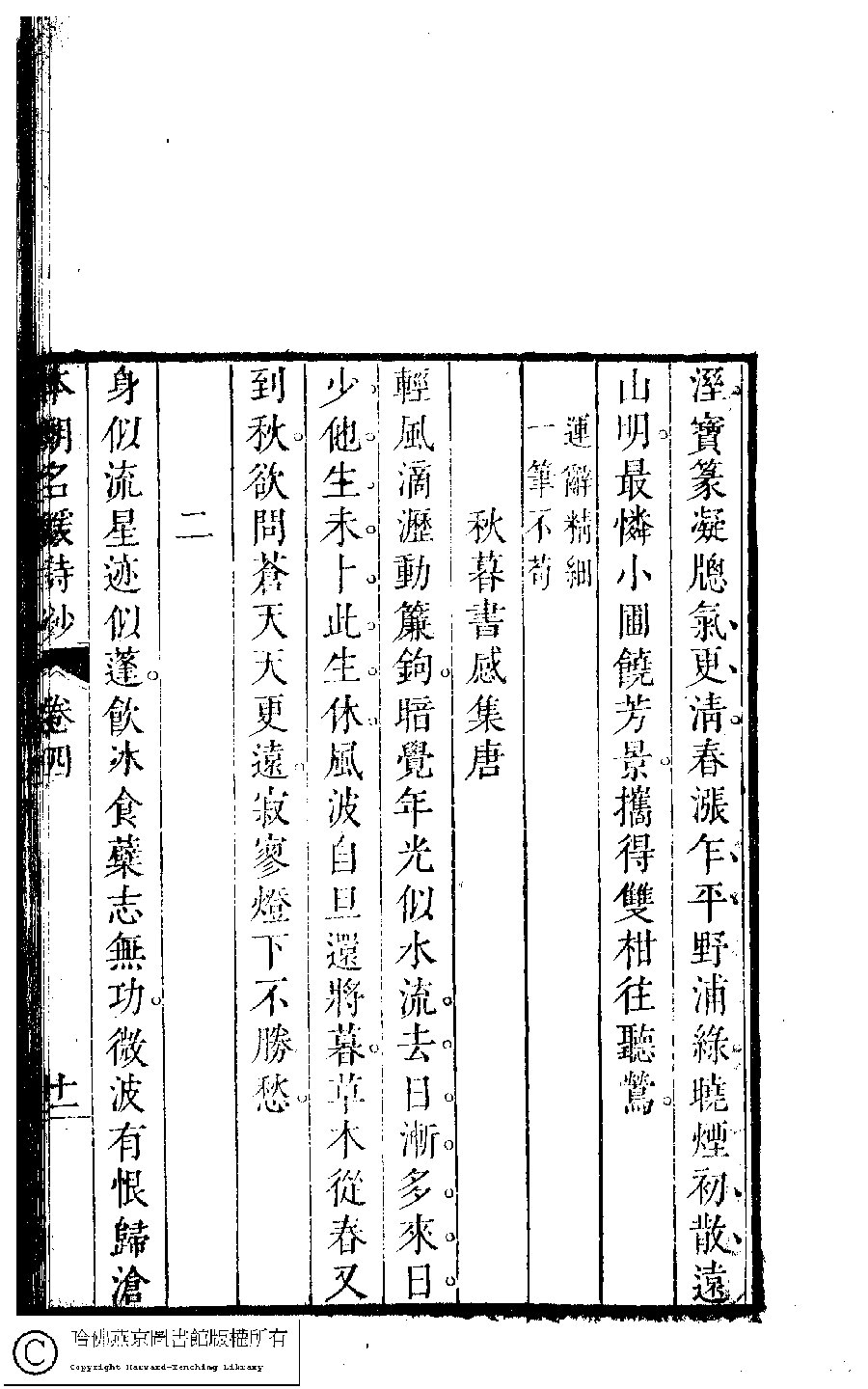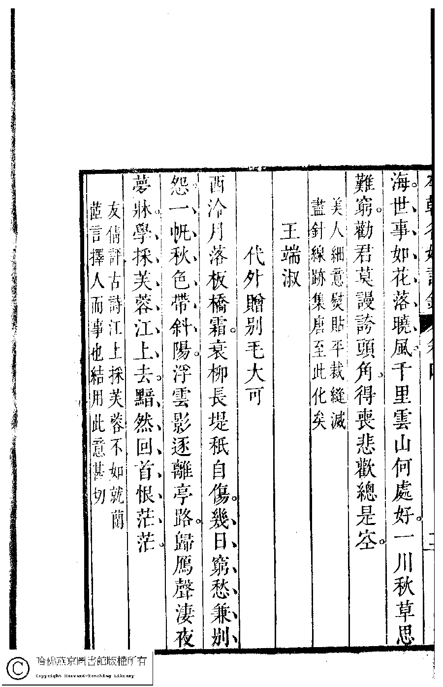 | (PRINT FRIENDLY VERSION) 本朝名媛詩鈔﹕六卷(清胡孝思輯)。清康熙五十五年(1716)凌雲閣刻本 ![]() 頁碼 : 4.11b | 点 击 放 大 | 本朝名媛詩鈔﹕六卷(清胡孝思輯)。清康熙五十五年(1716)凌雲閣刻本![]() 頁碼 : 4.11a | 点 击 放 大 | 返回 |