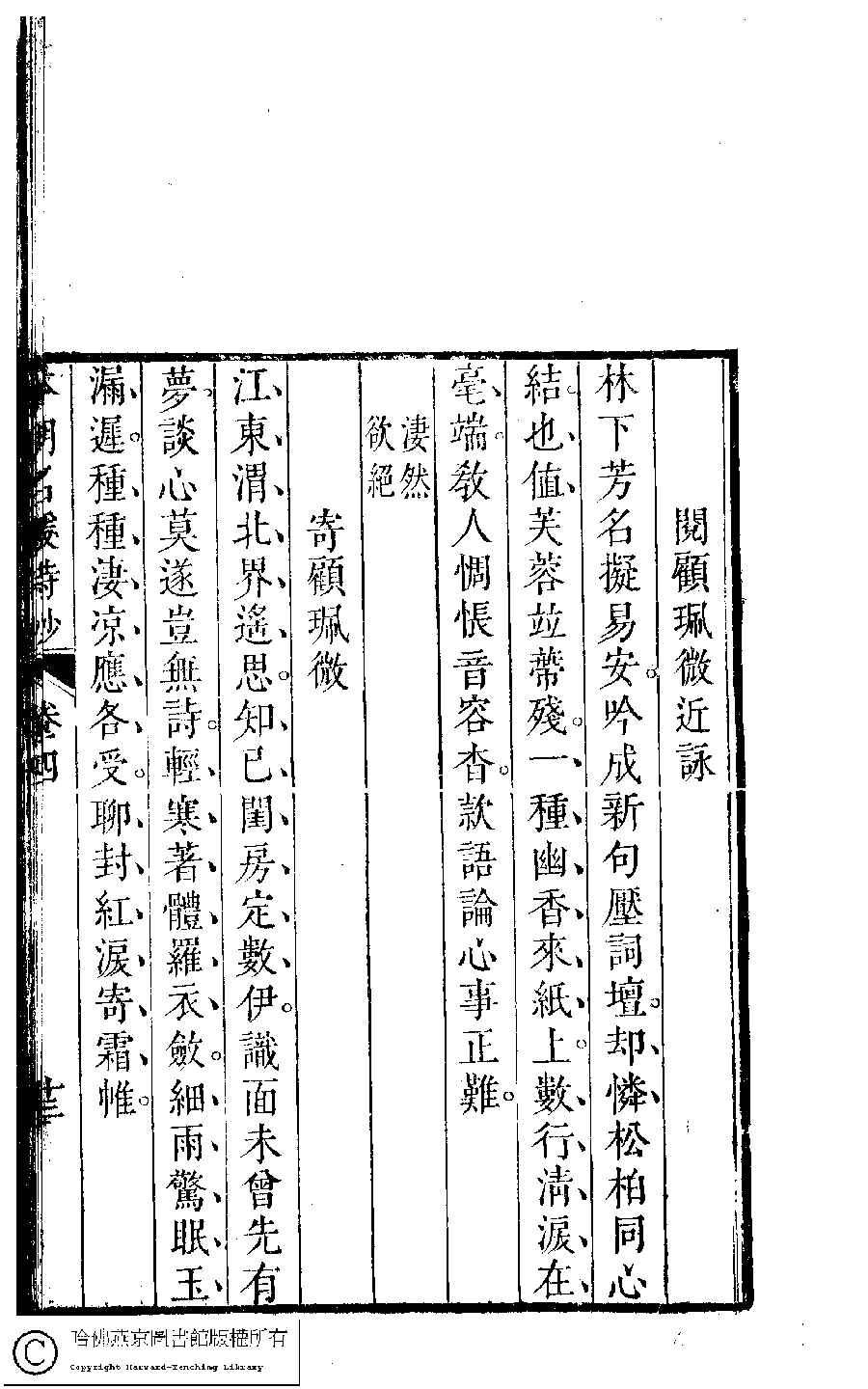 | (PRINT FRIENDLY VERSION) 本朝名媛詩鈔﹕六卷(清胡孝思輯)。清康熙五十五年(1716)凌雲閣刻本 ![]() 頁碼 : 4.13b | 点 击 放 大 | 本朝名媛詩鈔﹕六卷(清胡孝思輯)。清康熙五十五年(1716)凌雲閣刻本![]() 頁碼 : 4.13a | 点 击 放 大 | 返回 |