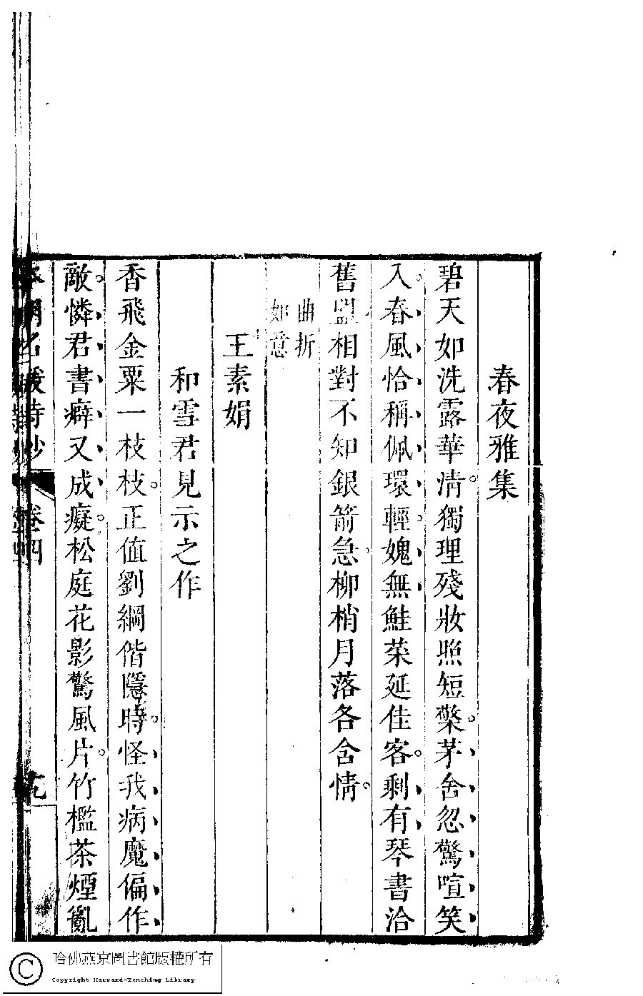 | (PRINT FRIENDLY VERSION) 本朝名媛詩鈔﹕六卷(清胡孝思輯)。清康熙五十五年(1716)凌雲閣刻本 ![]() 頁碼 : 4.19b | 点 击 放 大 | 本朝名媛詩鈔﹕六卷(清胡孝思輯)。清康熙五十五年(1716)凌雲閣刻本![]() 頁碼 : 4.19a | 点 击 放 大 | 返回 |
