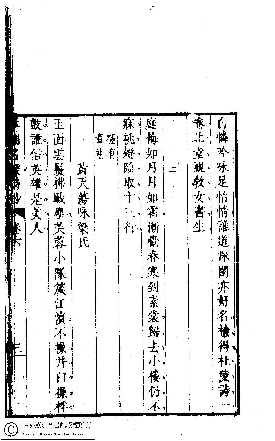 | (PRINT FRIENDLY VERSION) 本朝名媛詩鈔﹕六卷(清胡孝思輯)。清康熙五十五年(1716)凌雲閣刻本 ![]() 頁碼 : 6.3a | 点 击 放 大 | 本朝名媛詩鈔﹕六卷(清胡孝思輯)。清康熙五十五年(1716)凌雲閣刻本![]() 頁碼 : 6.2b | 点 击 放 大 | 返回 |