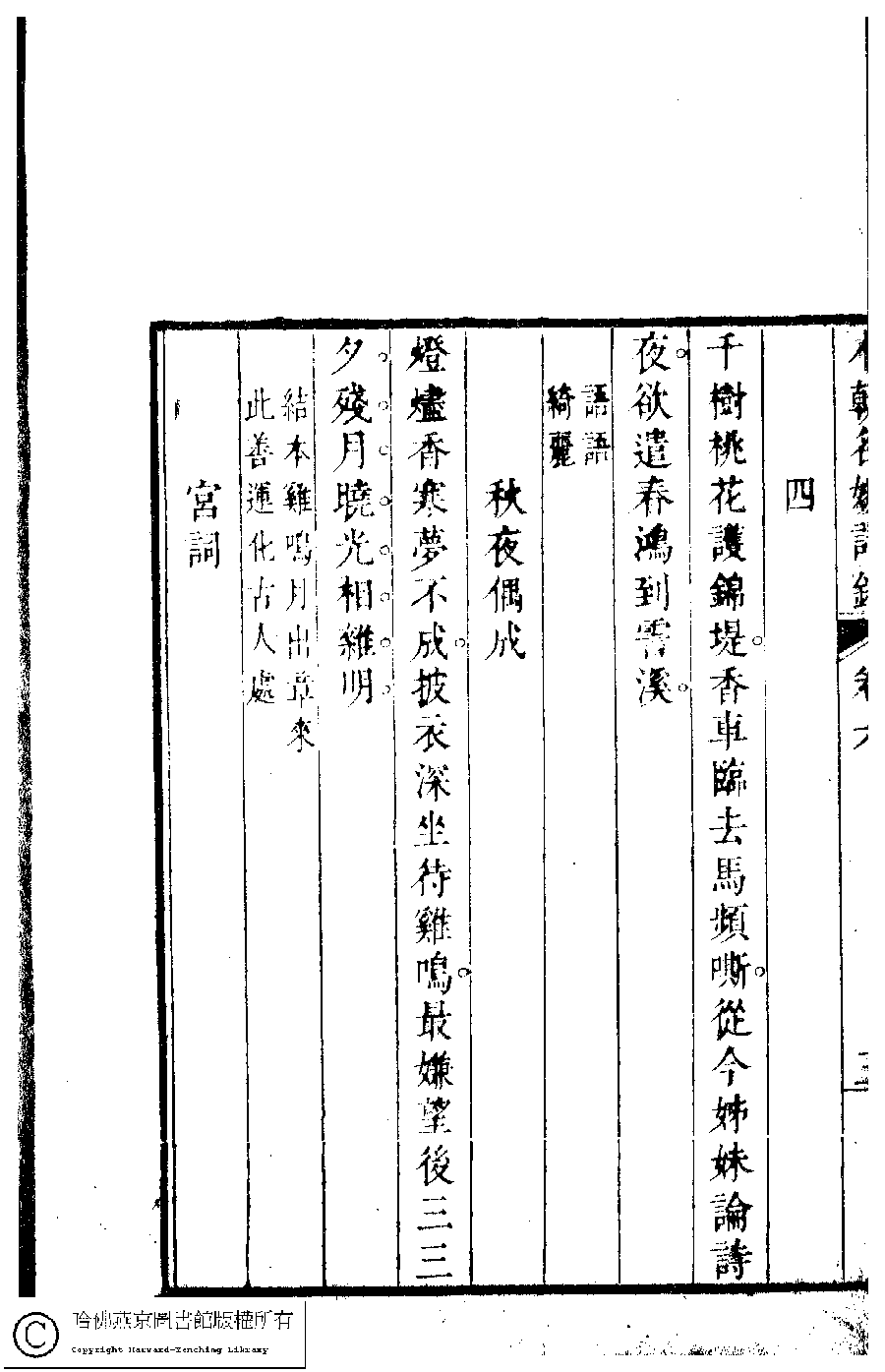 | (PRINT FRIENDLY VERSION) 本朝名媛詩鈔﹕六卷(清胡孝思輯)。清康熙五十五年(1716)凌雲閣刻本 ![]() 頁碼 : 6.5b | 点 击 放 大 | 返回 |