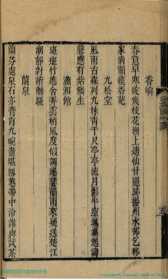 | (PRINT FRIENDLY VERSION) 清芬閣吟稿:一卷(清許英撰)。道光二十一年(1841)刊本 ![]() 頁碼 : 吟稿.5b | 点 击 放 大 | 返回 |
