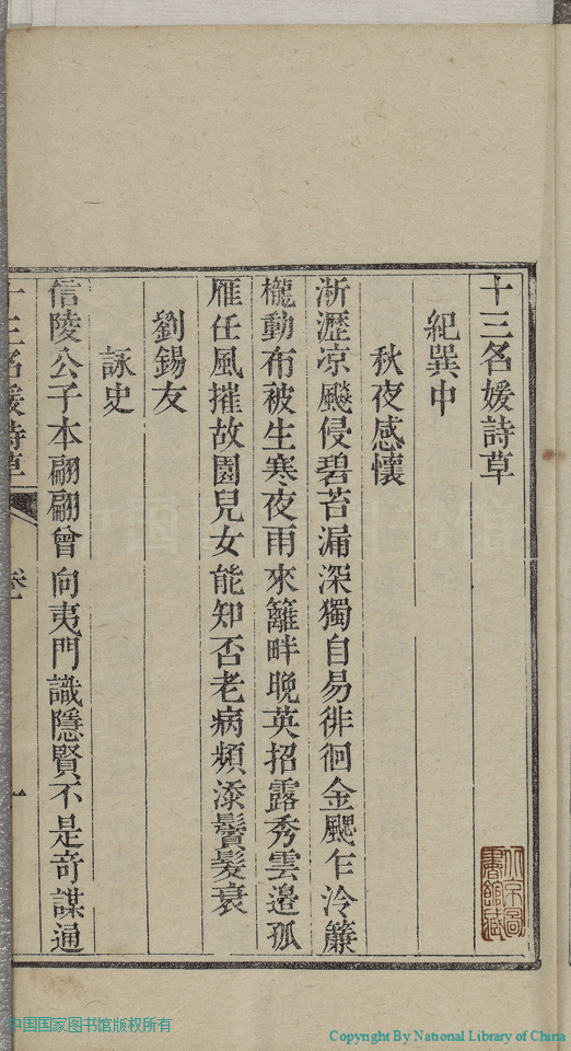 | (PRINT FRIENDLY VERSION) 重刻近月亭詩稿:四卷,附十三名媛詩草:一卷(清紀玘文撰)。嘉慶十九年(1814)刻本 ![]() 頁碼 : 十三名媛詩草.1a | 点 击 放 大 | 返回 |