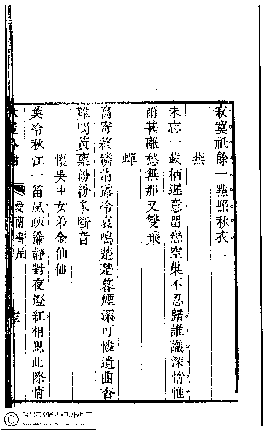 | 原書: 吳中女士詩鈔(清任兆麟輯,張滋蘭選): 愛蘭詩鈔﹕一卷 |