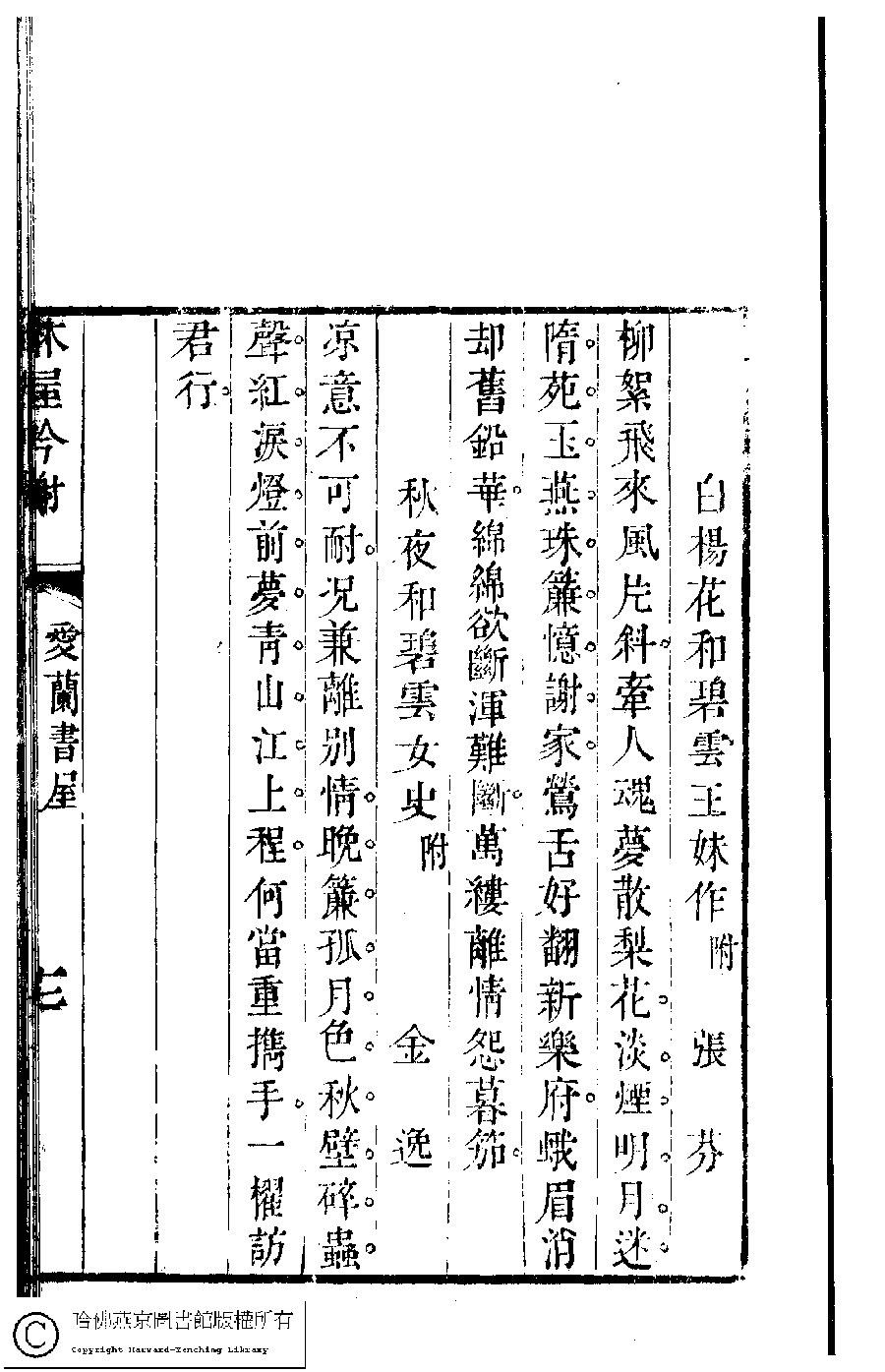 | 原書: 吳中女士詩鈔(清任兆麟輯,張滋蘭選): 愛蘭詩鈔﹕一卷 |