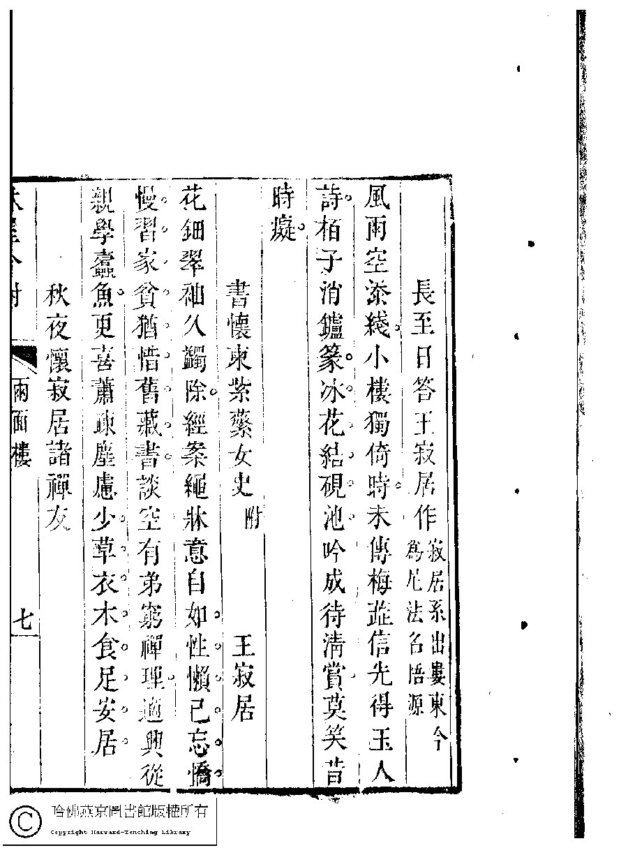 | (PRINT FRIENDLY VERSION) 吳中女士詩鈔(清任兆麟輯,張滋蘭選) : 兩面樓詩稿﹕一卷。清乾隆五十四年(1789)刻本 ![]() 頁碼 : 兩面樓.7a | 点 击 放 大 | 返回 |