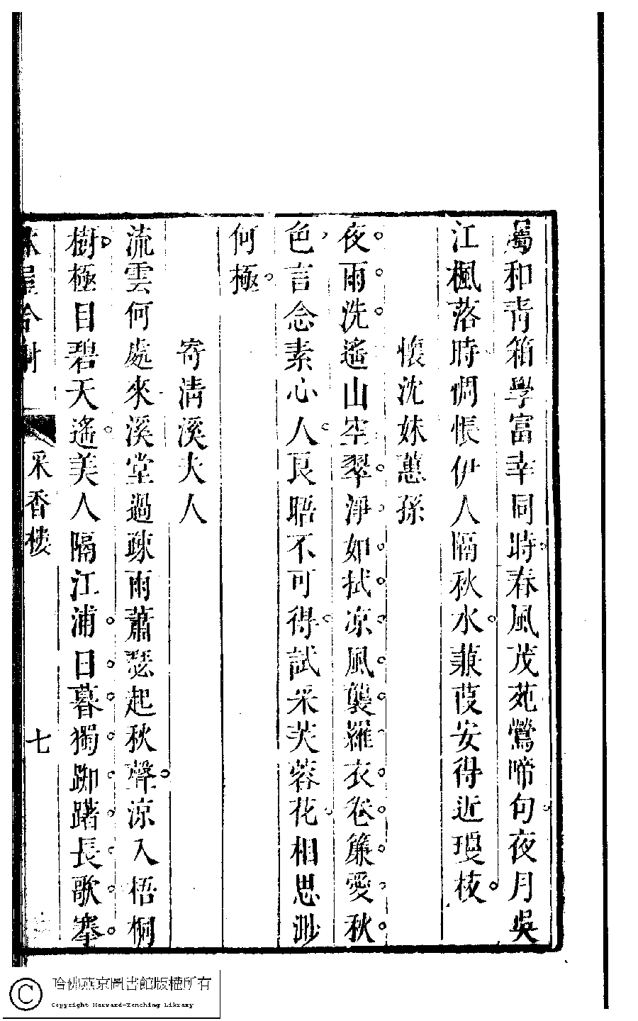 | (PRINT FRIENDLY VERSION) 吳中女士詩鈔(清任兆麟輯,張滋蘭選) : 采香樓詩集﹕一卷。清乾隆五十四年(1789)刻本 ![]() 頁碼 : 采香樓.7a | 点 击 放 大 | 返回 |