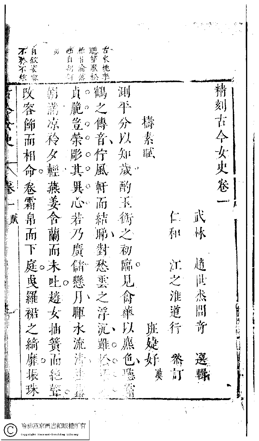 | 原書: 古今女史﹕十二卷﹐詩集﹕八卷﹐附姓氏字里詳節﹕一卷(明趙世杰輯) |
