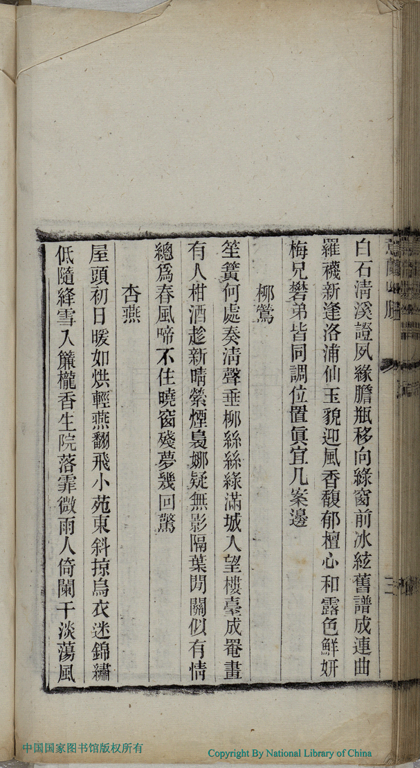 | (PRINT FRIENDLY VERSION) 意蘭吟剩:一卷(清吳毓蓀撰)。清光緒十七年(1891)刻本 ![]() 頁碼 : 吟剩.4a | 点 击 放 大 | 意蘭吟剩:一卷(清吳毓蓀撰)。清光緒十七年(1891)刻本![]() 頁碼 : 吟剩.3b | 点 击 放 大 | 返回 |