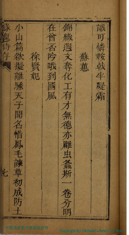 | (PRINT FRIENDLY VERSION) 綠窗詩存:一卷(清陳果撰)。清光緒八年(1882)刻本 ![]() 頁碼 : 詩存.7a | 点 击 放 大 | 返回 |