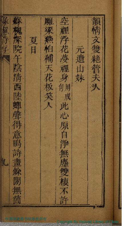 | (PRINT FRIENDLY VERSION) 綠窗詩存:一卷(清陳果撰)。清光緒八年(1882)刻本 ![]() 頁碼 : 詩存.9a | 点 击 放 大 | 綠窗詩存:一卷(清陳果撰)。清光緒八年(1882)刻本![]() 頁碼 : 詩存.8b | 点 击 放 大 | 返回 |