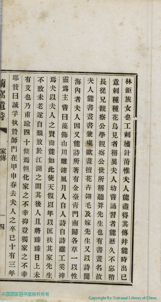 | (PRINT FRIENDLY VERSION) 繭窩遺詩:三卷(清張印撰) ![]() 頁碼 : 林母張夫人家傳.2b | 点 击 放 大 | 繭窩遺詩:三卷(清張印撰)![]() 頁碼 : 林母張夫人家傳.2a | 点 击 放 大 | 繭窩遺詩:三卷(清張印撰)![]() 頁碼 : 林母張夫人家傳.1b | 点 击 放 大 | 繭窩遺詩:三卷(清張印撰)![]() 頁碼 : 林母張夫人家傳.1a | 点 击 放 大 |