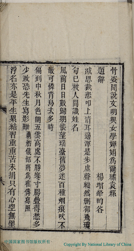 | (PRINT FRIENDLY VERSION) 妙香閣:一卷;附詩餘(清彭若梅撰)。清光緒三十三年(1907避垢廬)刻本 ![]() 頁碼 : 題辭.6b | 点 击 放 大 | 妙香閣:一卷;附詩餘(清彭若梅撰)。清光緒三十三年(1907避垢廬)刻本![]() 頁碼 : 題辭.6a | 点 击 放 大 | 返回 |