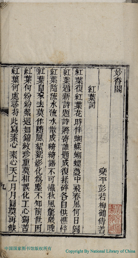 | 原書: 妙香閣:一卷;附詩餘(清彭若梅撰) |