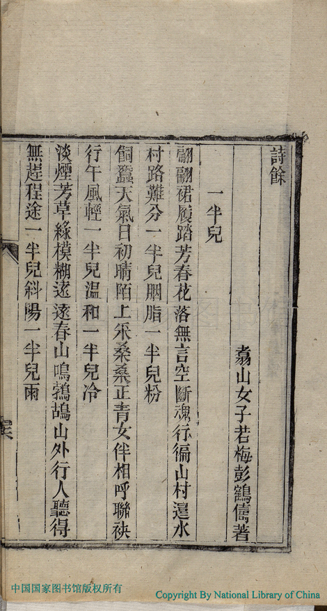 | 原書: 妙香閣:一卷;附詩餘(清彭若梅撰) |