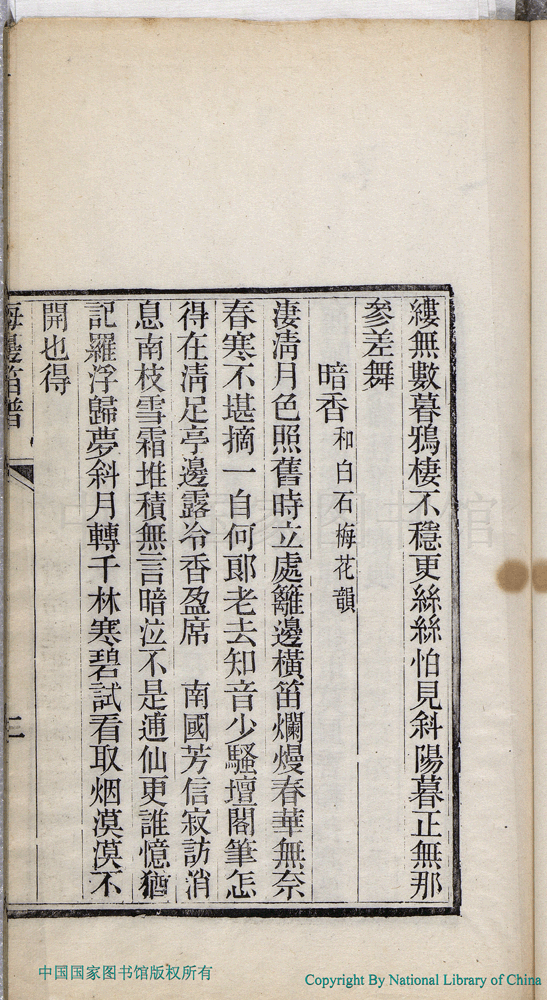 | (PRINT FRIENDLY VERSION) 梅邊笛譜:一卷(清蔣左賢撰)。清光緒十五年(1889)刻本 ![]() 頁碼 : 梅邊笛譜.2a | 点 击 放 大 | 返回 |