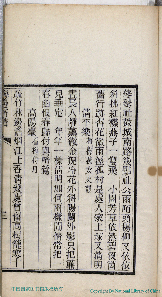 | (PRINT FRIENDLY VERSION) 梅邊笛譜:一卷(清蔣左賢撰)。清光緒十五年(1889)刻本 ![]() 頁碼 : 梅邊笛譜.3a | 点 击 放 大 | 返回 |